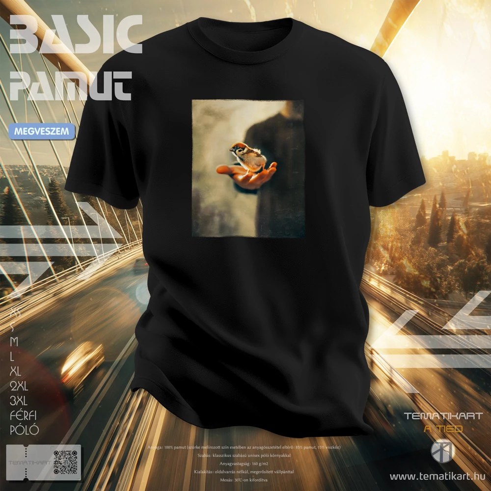 • Nyomtatás: a minta direkt textilnyomtatással (DTG) kerül a pólóra, fehér színűre közvetlenül, és a nyomat érezhetetlen, a színes pólóknál egy fehér alaprétegre nyomtatunk, a minta enyhén tapintható