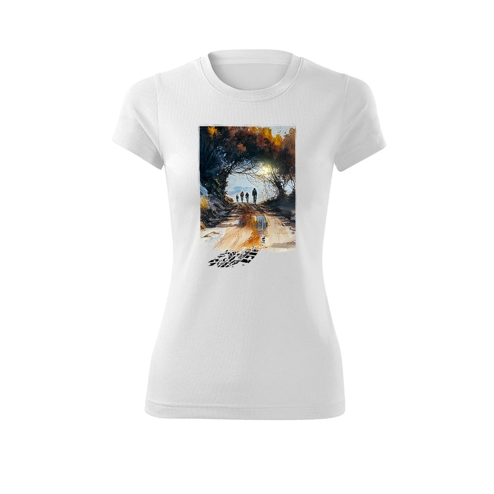 A Kéktúra grafikájú női póló a természetjárás élményét hozza közelebb: az ösvények felfedezése és a szabad levegő öröme minden nap veled lehet, városi sétán vagy túrán.