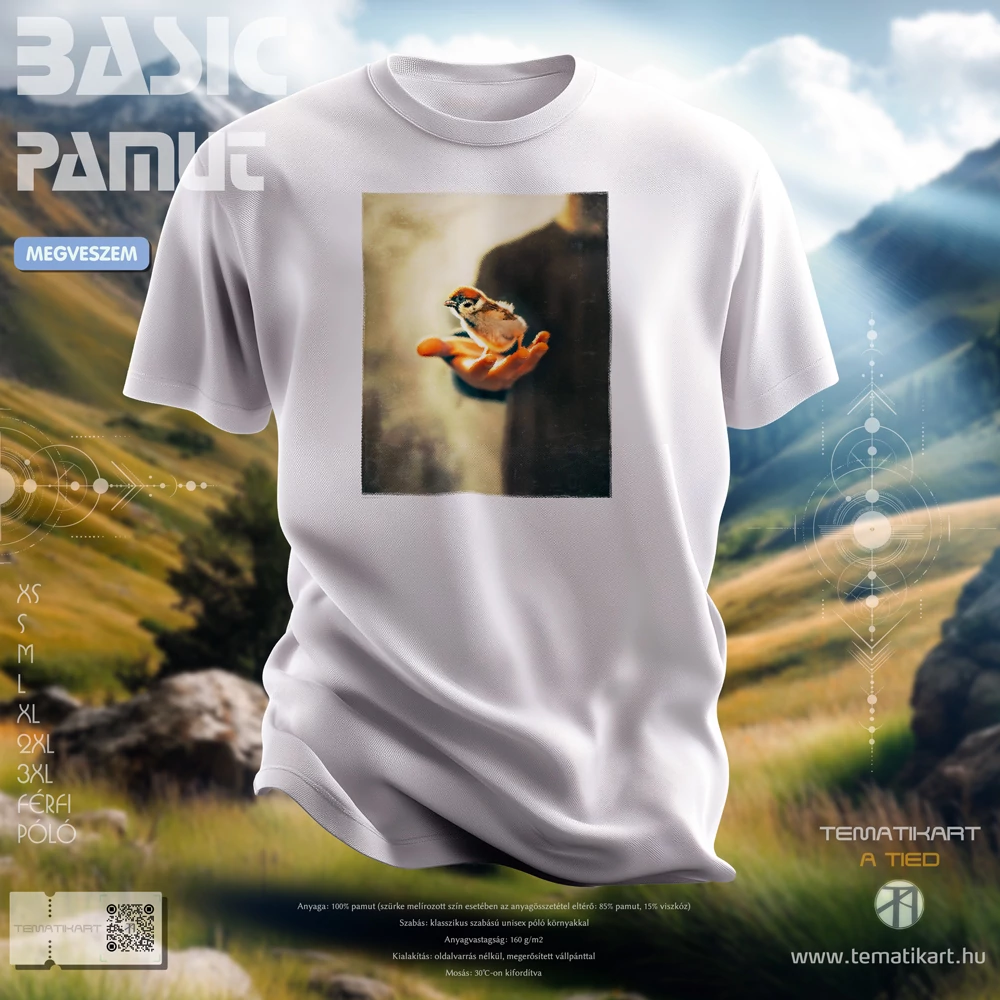 - Nyomtatás: a minta direkt textilnyomtatással (DTG) kerül a pólóra, fehér színűre közvetlenül, és a nyomat érezhetetlen, a színes pólóknál egy fehér alaprétegre nyomtatunk, a minta enyhén tapintható
